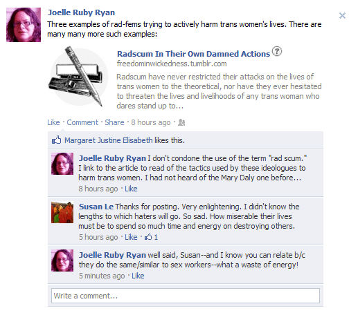 Radscum have never restricted their attacks on the lives of trans women to the theoretical, nor have they ever hesitated to threaten the lives and livelihoods of any trans woman who dares stand up to them.