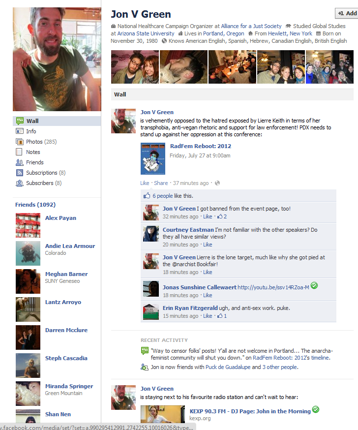 Jon is a self-appointed social justice warrior. Jon does not like that females are getting together in Portland to discuss radical feminism.
