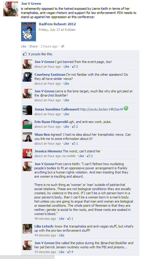 Jon think that it is bad that females should meet WITHOUT HIM! So Jon has decided to take it upon himself to let the conference organizers know that “the anarcha-feminist community will shut you down.”