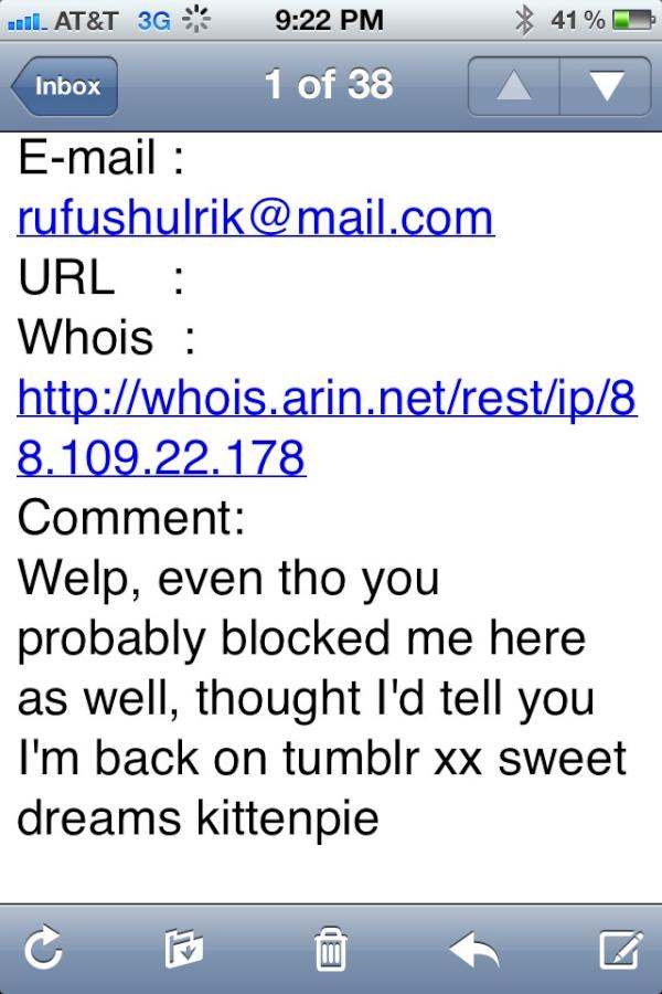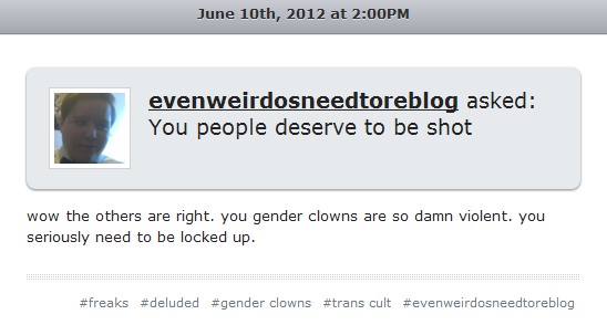 I am also reporting this user to Tumblr for abuse by copy of this email. They are user http://evenweirdosneedtoreblog.tumblr.com/