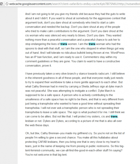 My initial reaction to Cathy when she greeted my friend was that, perhaps, she was going to sincerely apologize for the horrible things she had done, and truly have an open discussion. But the tone from Cathy changed, and my friend kept trying to speak up, only to be interrupted time and time and time again by Cathy Brennan and her ignorance. I couldn’t keep my mouth shut anymore.