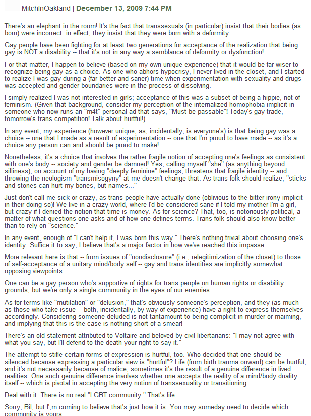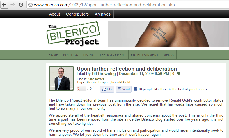 Now I must sadly report an egregious instance. Bilerico is one of the leading GLBTQ sites on the Internet. Recently, the administrators of the site invited Ronald Gold to serve as a columnist. Gold, a veteran New York City gay activist who earned our respect for his selfless work in the years immediately following Stonewall, chose to write his first column on a controversial subject, the rationale regarding transgendered people. He apparently did not realize that this was a no-go zone. These individuals are the poster children of the current postmodernist phase of the LGBTQ movement (perhaps I should write lgbTq movement). At all events a fire storm ensued. Gold was immediately sacked, and the offending column was deleted from the site.