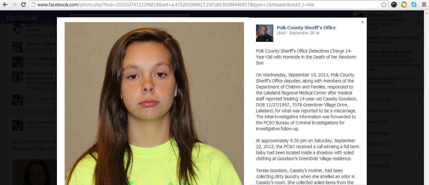 Media contact Donna Wood in the Polk County Sheriff’s Office told me that the although the investigation is ongoing, the department is looking into filing “lewd and lascivious” charges against another juvenile for getting her pregnant. She states that the rape shield law doesn’t apply.