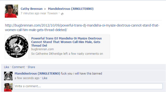 So Catherine Ditheridge left a few nasty comments on my blog, which led to this exchange on my Facebook page. A DJ called Mandisha Oi Mysize Dextrous jumped in, completely irate because we didn’t recognize him as a woman. He did, however, apparently get the thread deleted right quick.