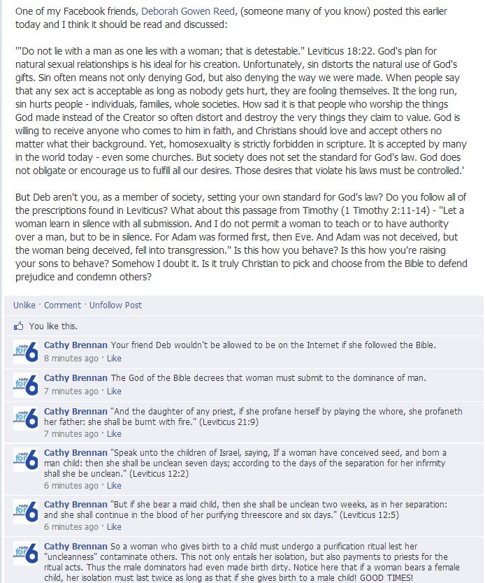 I think a better 2012 interpretation of this Leviticus ‘gem’ is to keep loving women and do not have sexual relations with men because men are detestable. That’s the way I read it anyway!