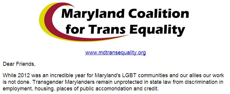 “While 2012 was an incredible year for Maryland’s LGBT communities and our allies our work is not done. Transgender Marylanders remain unprotected in state law from discrimination in employment, housing, places of public accomondation (sic) and credit.”