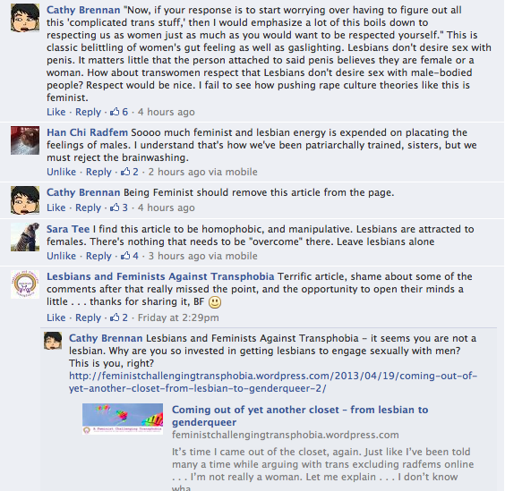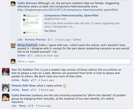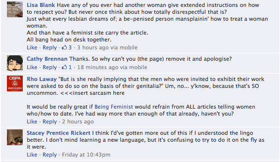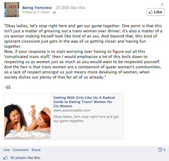 “Feminist” Facebook page with 25,000 likes posts homophobic article discussing Lesbian sexuality and how Lesbians need to learn to appreciate penis so Lesbians and “people with penises” can have “fun” together.