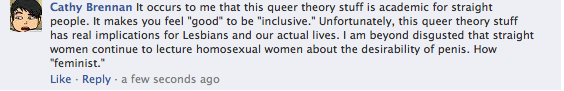 So, it’s bad enough that, on a theoretical level, a feminist woman cannot follow an analysis about compulsory heterosexuality, etc.